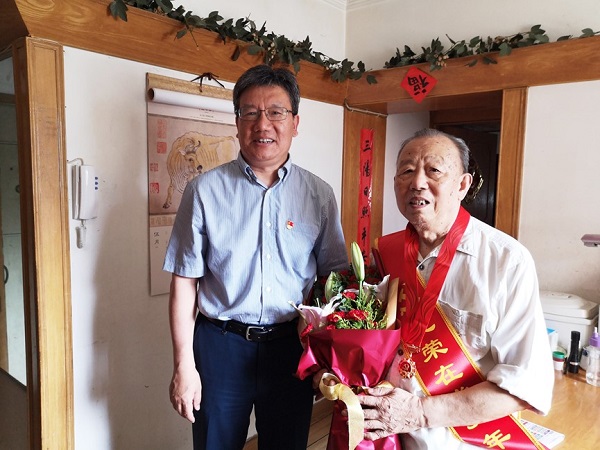 6月28日,北自所黨委書記、董事長王振林,黨委副書記、總經(jīng)理李金村,黨委副書記、紀(jì)委書記、工會主席岳秀江,代表公司黨委班子,來到離退休老黨員家中走訪,為黨齡50年的老黨員頒發(fā)“光榮在黨50年”紀(jì)念章。